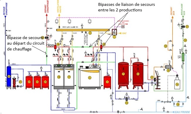 Dans le schéma de principe, comme repérés ci-dessous, les bipasses de secours sont dessinés en vert.La tuyauterie de bipasse de secours au départ du circuit de chauffage permet d'y régler par mélange la température de départ, en fonction de la température extérieure moyenne.
